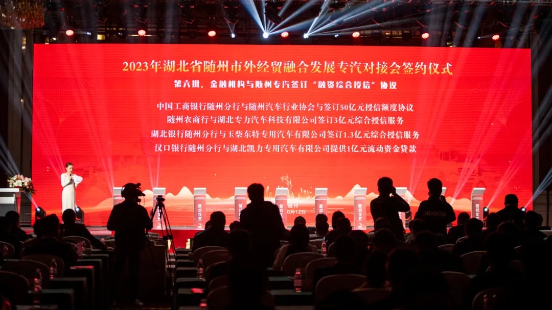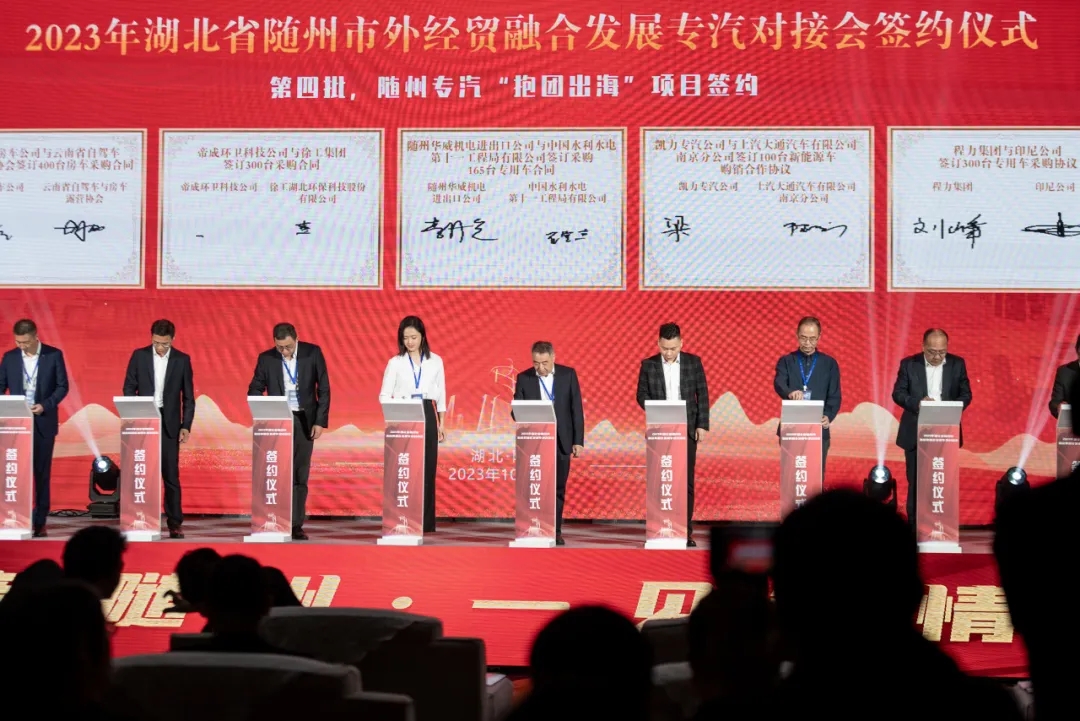 2023年湖北省随州市外经贸融合发展专汽对接会暨“一带一路”提倡十周年高峰论坛在湖北省随州市举行,凯力汽车集团受邀参加,并参与了随州专汽“抱团出海”项目签约,和上汽跃进公司签订100台新能源车购销合作协议,在专用车新能源领域开启“奔跑”模式。