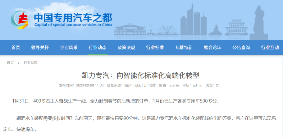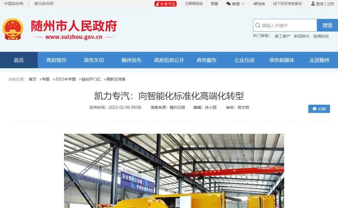 ● 随州日报头版头条《凯力专汽:向智能化标准化高端化转型》特别报道,用品质赢得市场,加快产品研发、技术升级、品质提升、力争高附加值产品大幅提高占比,向智能化标准化高端化转型升级。随州市人民政府官网、随州日报、随州电视台综合频道、随州市经济和信息化局官网、随州日报抖音官方号、随州论坛、云上随州等媒体平台跟踪报道。