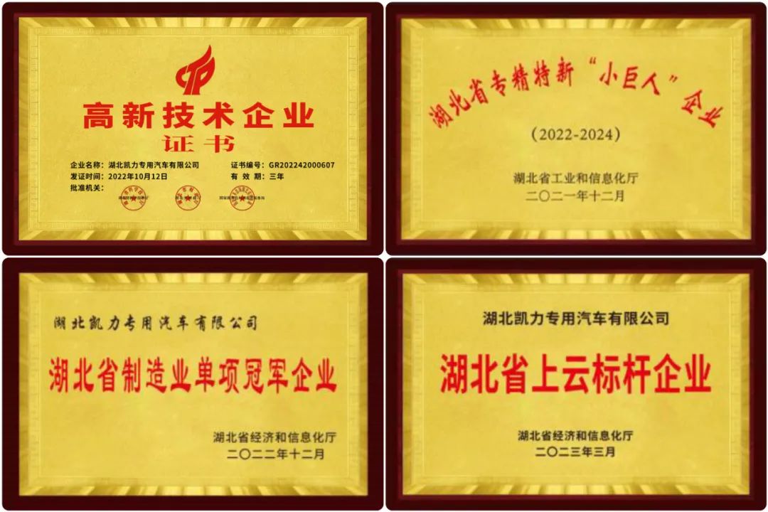 “专汽产品”向“专汽品牌”的转变是个漫长的过程,七年创业、七年成长,历经三次搬迁,五次扩张,凯力专汽从无到有,从创立之初的年产销量数百台到现如今年销量过万台,年产值更是以平均45%的增长率一路领跑,2021年正式突破10亿大关,市场占有率正式跨入行业第一梯队。环卫系列产品销量突破6万台,多功能抑尘车市场占有率达20.43%,排名全国第一,环卫压缩垃圾车排名全国第三。荣膺国家高新技术企业、湖北省专精特新小巨人企业、湖北省制造业单项冠军企业、湖北省优势商标企业、湖北省上云标杆企业等以及荣获中国质量检验协会颁发的四大质量诚信认证等诸多荣誉。