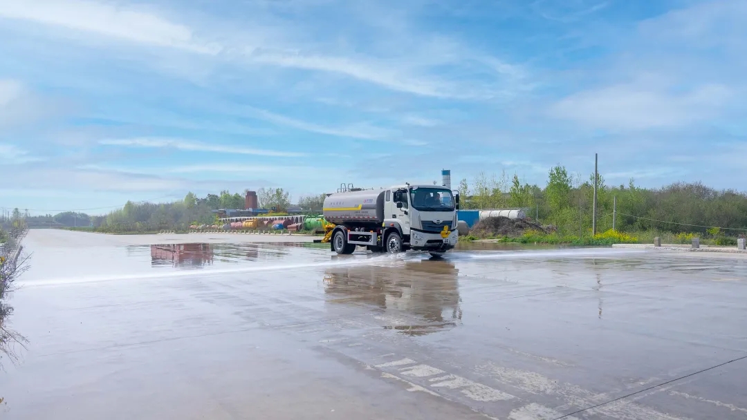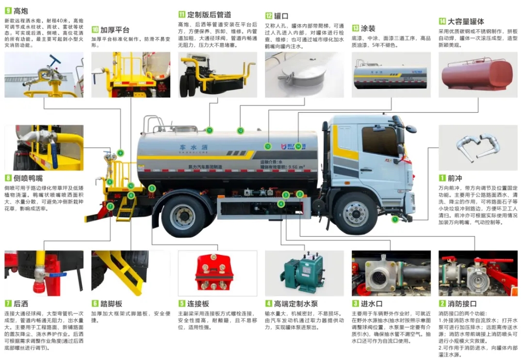 产品标配前冲、后洒、侧喷、后置式工作平台、平台上有高压水炮(可360°旋转,水雾形状可调成直冲状、 大雨、 中雨、 小雨、毛毛雨;调成直冲状最大射程≧ 35 米,也可调成雾状最大射程≧15 米)、配备优质大功率专用洒水泵,品牌取力器、杂物过滤网、国标通用65型消防接口(可通过消防栓加水)、1 套自流球阀系统(可自吸自排,最大吸程 7 米)、2根引水钢丝胶管。适用于各种路面清洗;树木、绿化带、草坪绿化;道路、厂矿企业施工建设、高空建筑冲洗。具有洒水、压尘、高(低)位喷洒、农药喷洒、护栏冲洗、应急消防等多种功能。