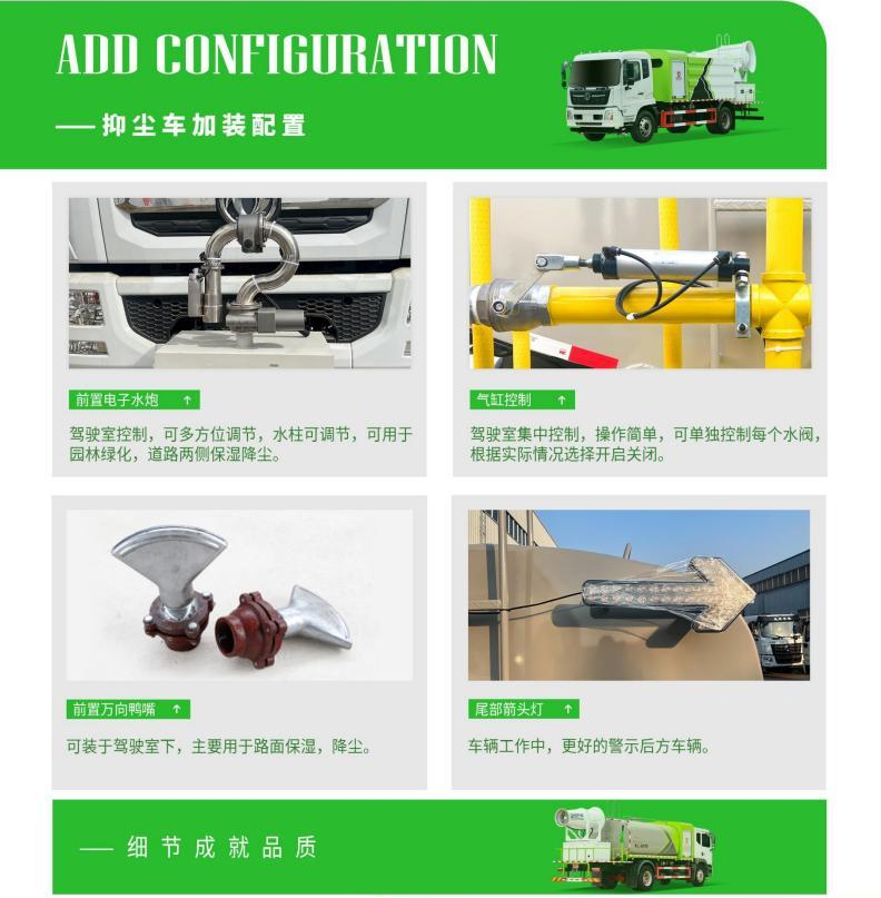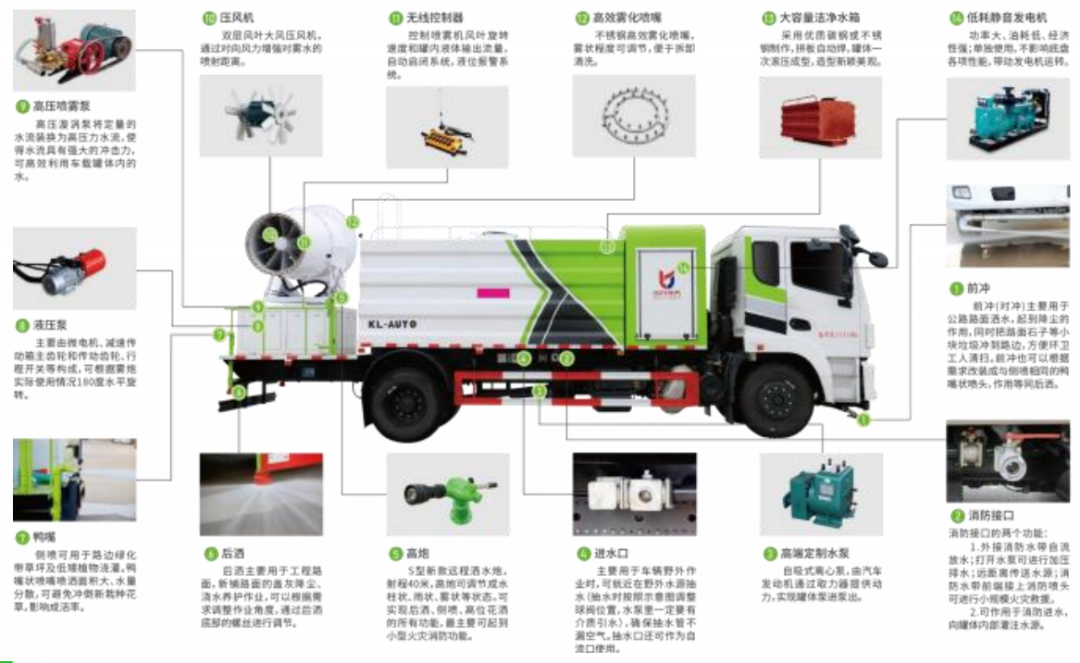 功能:功能丰富,操作简单。在抑尘同时配备洒水泵。可实现绿化喷洒功能和低压消防洒水功能。喷雾机也可以作为农药喷洒装置使用,一车多用,喷雾车上装载有高性能远程喷雾机,射程远、覆盖范围广、工作效率高、除尘速度快。