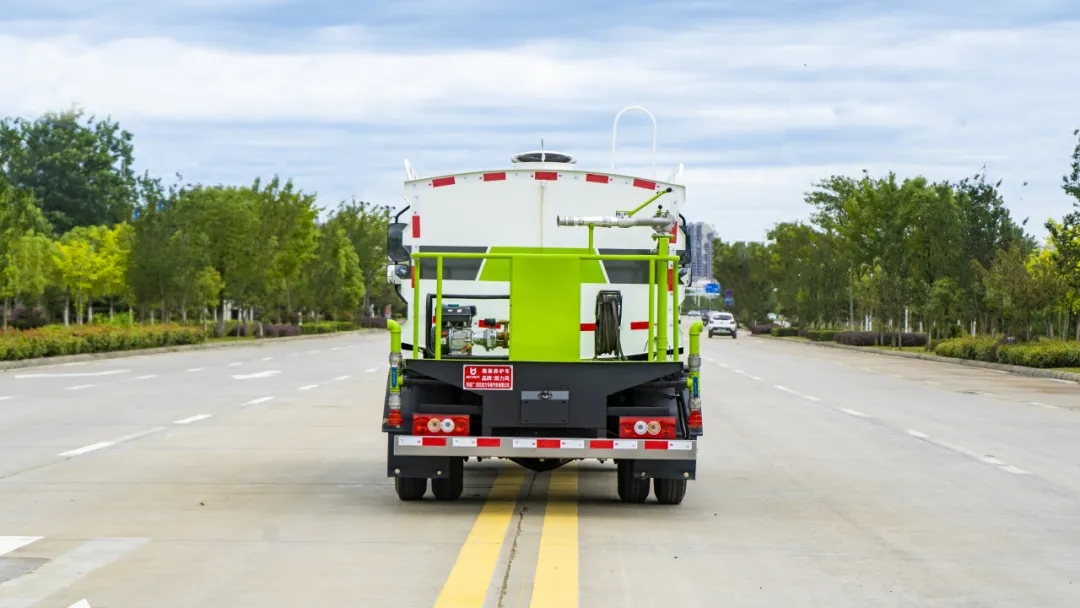 配备优质大功率专用洒水泵,取力器,杂物过滤网,国标通用 65 型消防接口(可通过消防栓加水),2 根引水钢丝胶管。水泵、取力器、球阀、滤网均为国家标准产品,主管道加粗,法兰垫、法兰盘加厚,万向前冲,大通径球阀,具有性能优良,工作可靠、效率高、流量大。尾部雾炮能有效的对雾霾、灰尘进行有效的抑制效果。