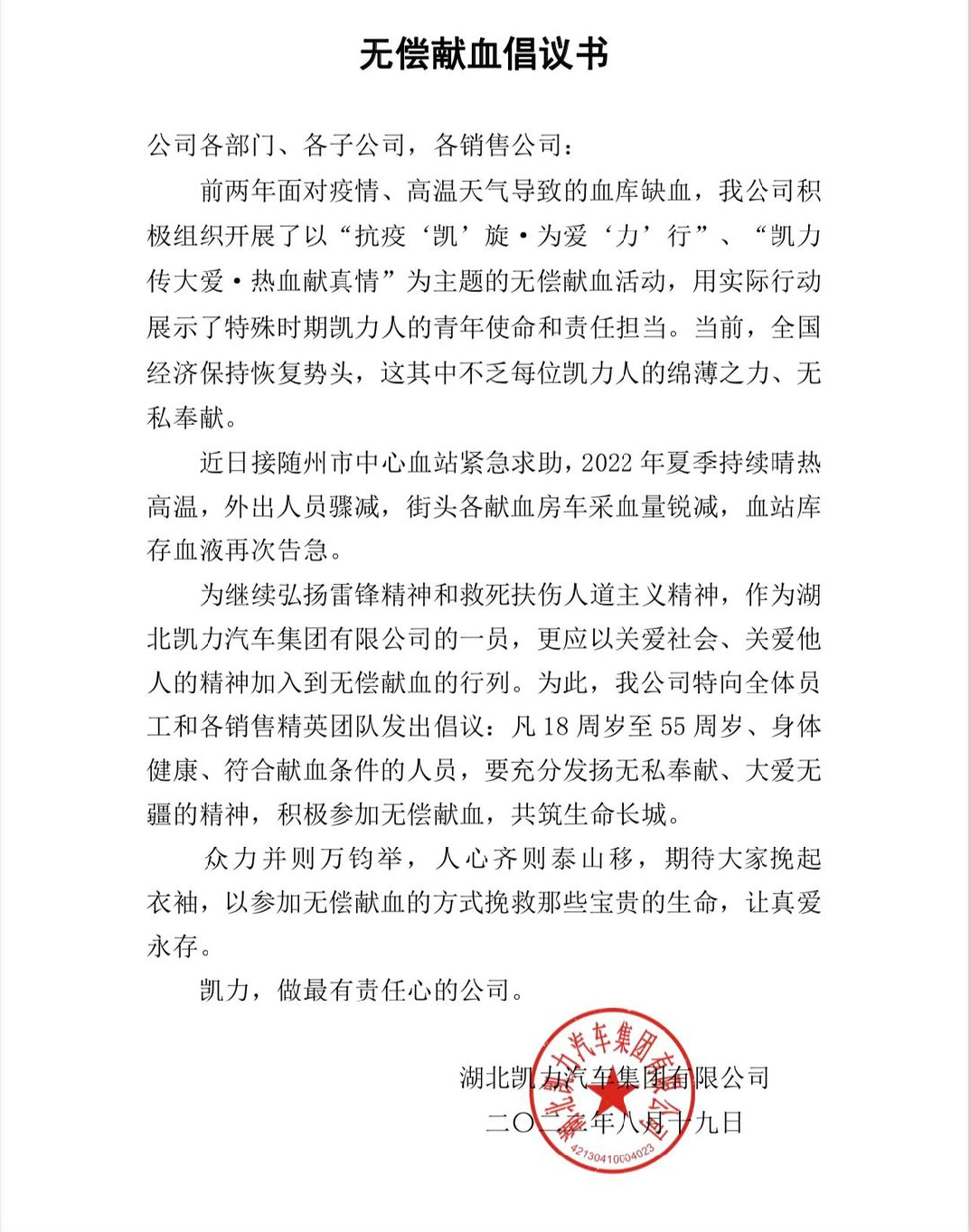 以热血凝聚爱心,用行动诠释奉献,为保障常态化疫情防控及高温期间全市医疗用血供应,满足医疗需求,为随州市人民群众生命安全和身体健康奉献专汽人的一片爱心。8月24日凯力汽车集团积极响应,开展以“凯力传大爱·热血献真情”为主题的无偿献血公益活动,为随州市频频告急的血库增添了宝贵的血源。