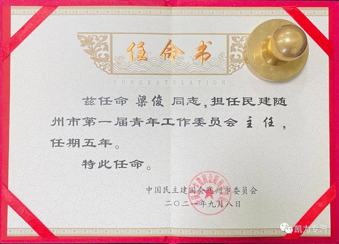 梁俊表示,凯力专汽今后将积极融入青工委“大舞台”,激扬凯力青春力量,展现凯力青春风采,带领随州民建青工委首届班子成员精诚团结,与时俱进,开拓创新,以一流成绩服务发展、服务社会,努力为区域经济社会发展贡献青春、智慧和力量。