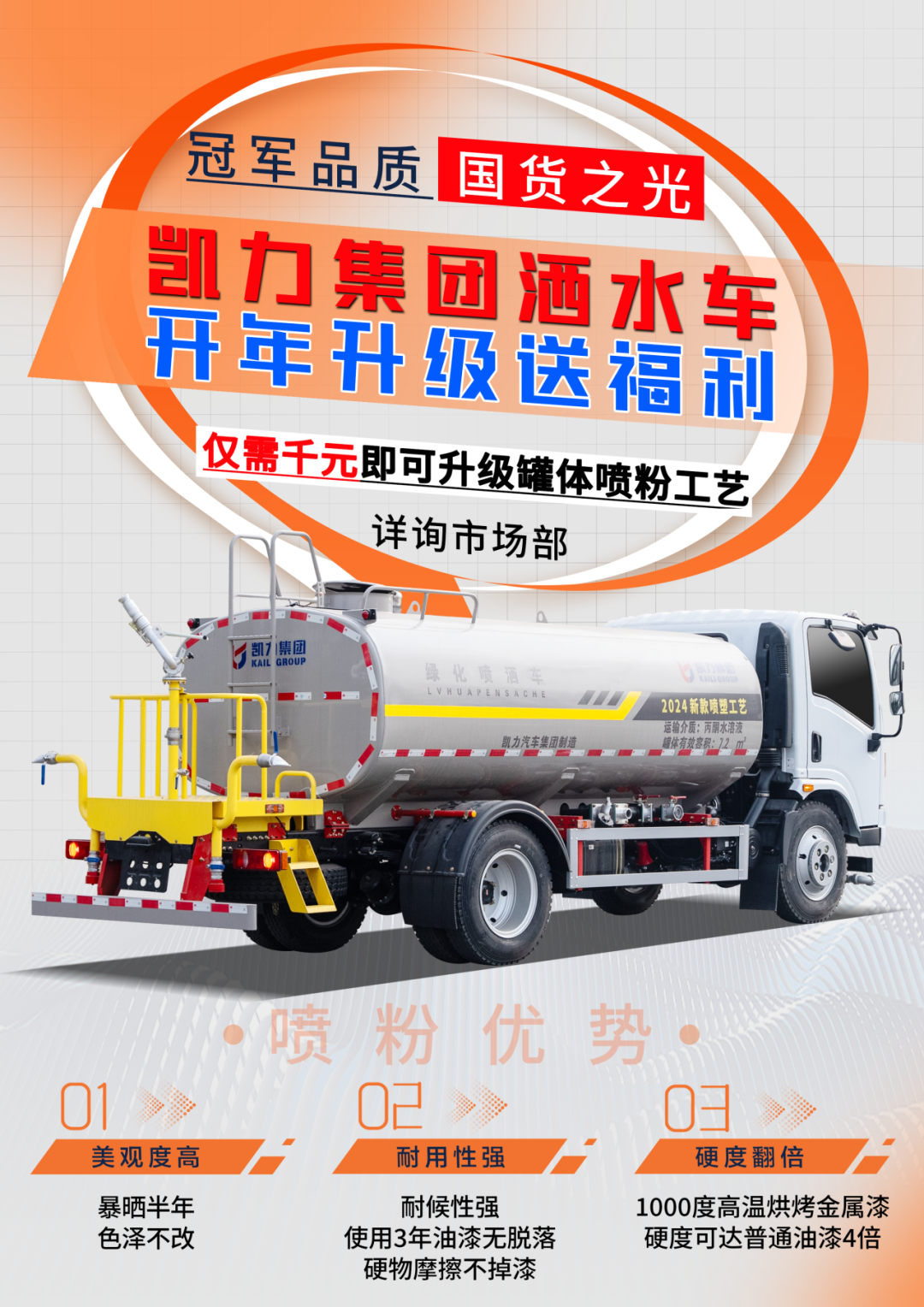 开年升级送福利!凯力集团新年洒水车升级送福利啦!凡选购凯力风23款洒水车系列车型,额外可享千元配罐体喷粉工艺!详询市场部或私信我们留下您的联系方式。耐磨度、耐候性更强!光泽度更好!使用周期更长!性价比